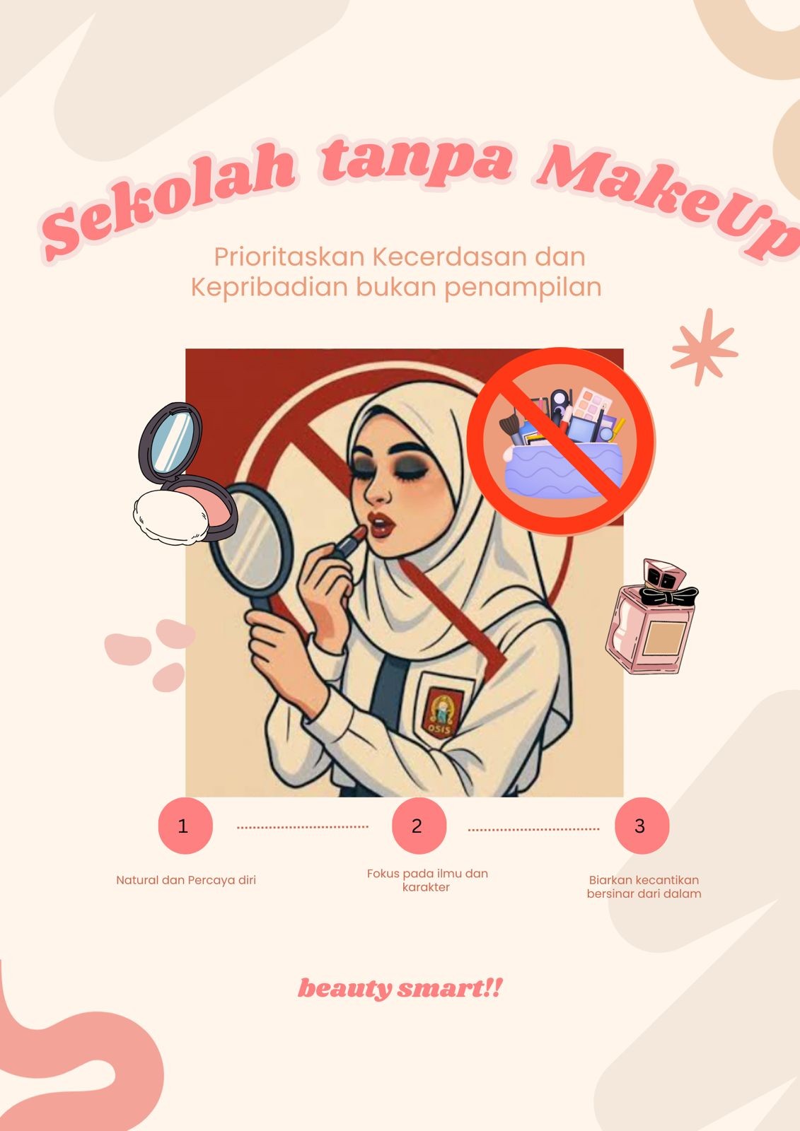 Makeup itu bukan musuh. Makeup juga bukan hal terlarang. Yang penting adalah bagaimana kita menggunakannya dengan bijak, sesuai tempat dan situasi. Makeup natural sudah sangat cukup bikin kita tampil percaya diri tanpa harus ganggu proses belajar. Karena pada akhirnya, yang lebih penting bukan seberapa tebal riasan yang kita pakai… tapi seberapa besar usaha kita buat belajar, berkembang, dan jadi versi terbaik dari diri sendiri.